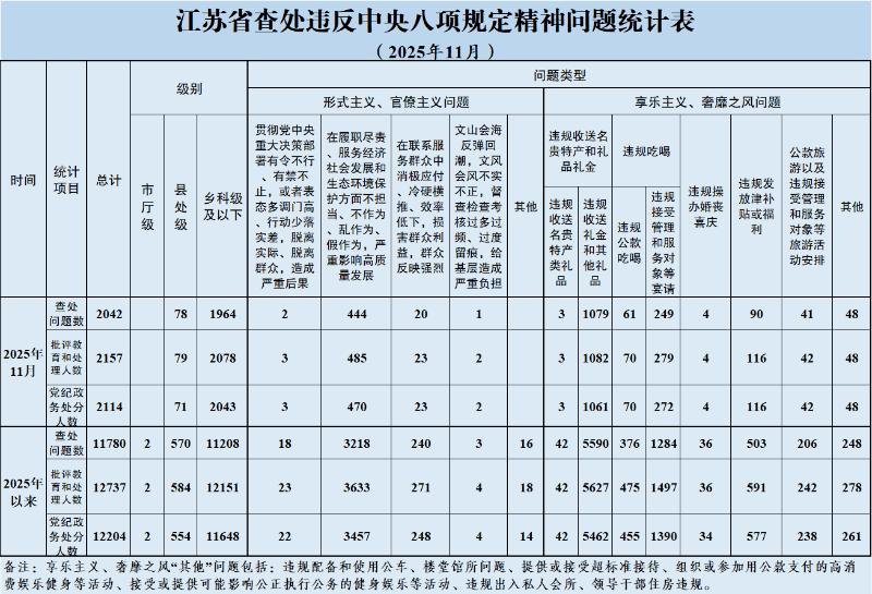 2025年11月,全省共查处违反中央八项规定精神问题2042起,批评教育和处理2157人、其中给予党纪政务处分2114人。从问题类型看,查处形式主义、官僚主义问题467起、批评教育和处理513人,查处享乐主义、奢靡之风问题1575起、批评教育和处理1644人。从人员级别看,批评教育和处理县处级干部79人、乡科级及以下人员2078人。